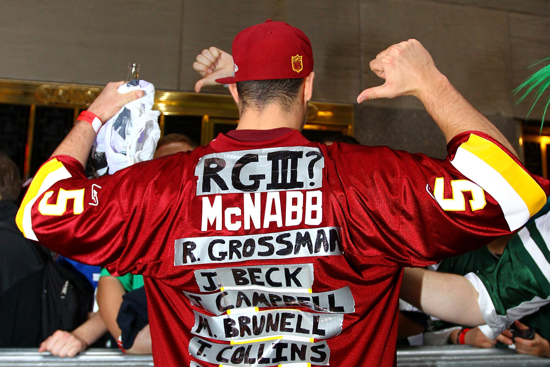 NEW YORK, NY – APRIL 26: A fan of the Washington Redskins wears a jersey with the names of some of the Redskins previous quartebacks including quarterbacl prospect Robert Griffin III from Baylor during the 2012 NFL Draft at Radio City Music Hall on April 26, 2012 in New York City. (Photo by Al Bello/Getty Images)