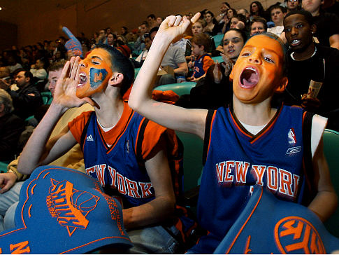 Knicks fans Kevyn Mayhew, 17,(left) and his brother Austin Mayhew, 12, cheer for the Knicks during their game against the Charlotte Bobcats on Jan. 12th from the same section where seats were empty and fans were sleeping on Dec. 6th. Original Filename: 03.JPG