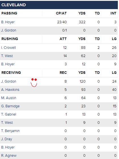Game Balls– Josh Gordon, Andrew Hawkins, Isaiah Crowell, Joel Bitonio, Paul Kruger, Joe Haden, Craig Robertson, Billy Cundiff