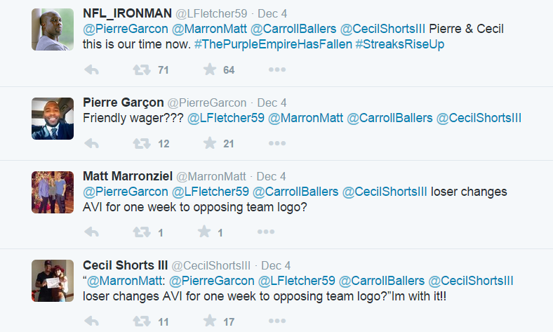 In the spirit of the game, a couple of former Mount Union greats in Pierre Garcon & Cecil Shorts and the best player to ever don a John Carroll jersey (Fletcher) decided to put a little friendly wager on the outcome.