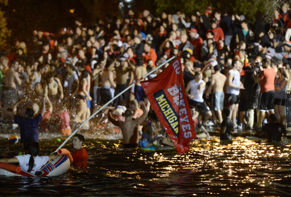 Ohio State students participate in the annual tradition of of jumping in Ohio State’s Mirror Lake on the campus, November 20, 2012. Hundreds gathered at the university’s popular land mark for the ritual that happens on Michigan week. (Dispatch photo by Neal C. Lauron)