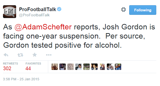 Pro Football Talk is reporting it was a positive test for alcohol