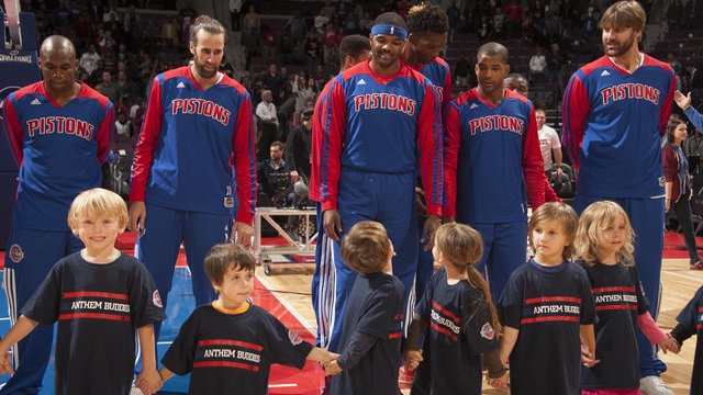 AUBURN HILLS, MI – OCTOBER 7: Young fans of the Detroit Pistons line up for the national anthem before the game against the Chicago Bulls on October 7, 2014 at The Palace of Auburn Hills in Auburn Hills, Michigan. NOTE TO USER: User expressly acknowledges and agrees that, by downloading and/or using this photograph, User is consenting to the terms and conditions of the Getty Images License Agreement. Mandatory Copyright Notice: Copyright 2014 NBAE (Photo by Dan Lippitt/NBAE via Getty Images)