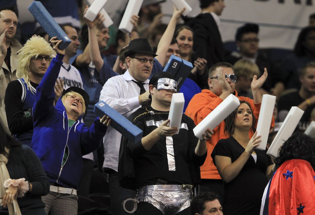 Basketball fans, many in costume, stood and cheered in the section allocated for Super Fans during the Minnesota Timberwolves game against the Houston Rockets Monday night, January 23, 2012, at Target Center in Minneapolis, Minn. ] JEFF WHEELER • jeff.wheeler@startribune.com