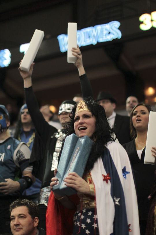Joanne Taylor was among the basketball fans, many in costume, in the section allocated for Super Fans during the Minnesota Timberwolves game against the Houston Rockets Monday night, January 23, 2012, at Target Center in Minneapolis, Minn. ] JEFF WHEELER • jeff.wheeler@startribune.com
