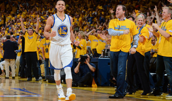 OAKLAND, CA – APRIL 28: Stephen Curry #30 of the Golden State Warriors celebrates with team majority owner Joe Lacob while playing against the Denver Nuggets in Game Four of the Western Conference Quarterfinals during the 2013 NBA Playoffs on April 28, 2013 at the Oracle Arena in Oakland, California. NOTE TO USER: User expressly acknowledges and agrees that, by downloading and/or using this Photograph, user is consenting to the terms and conditions of the Getty Images License Agreement. Mandatory Copyright Notice: Copyright 2013 NBAE (Photo by Garrett W. Ellwood/NBAE via Getty Images)