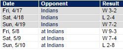 The Royals are only 5-5 in their last ten and still have a game over the second-place Kitties. Tribe fans can take some solace in the fact that it isn’t just us that Mike Moustakas is crushing this year, it’s everyone (.319/.338/.448). The same goes for pretty much their entire lineup, as the baby blue bullies lead the majors in hitting by a whopping 13 points.