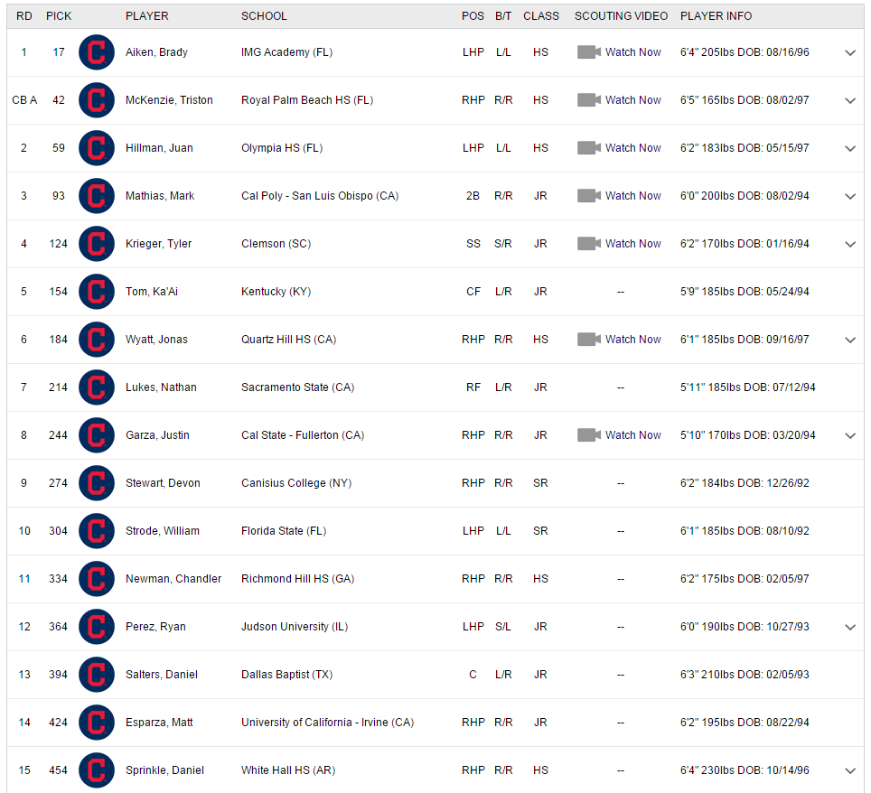 - (17) Brady Aiken LHP – Talked about him a little in our Tribe notes this week. Basically, if this kid comes close to what he was before Tommy John, this could be a franchise-changing steal. You don’t get compared to Clayton Kershaw by accident.