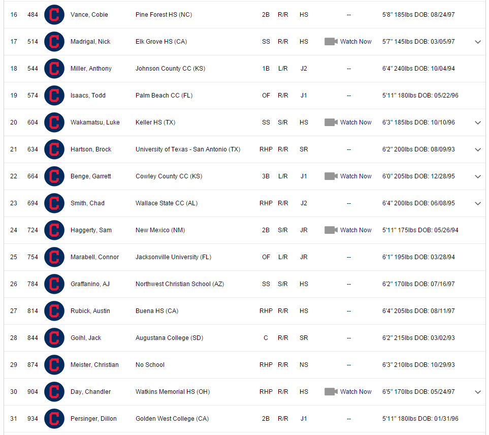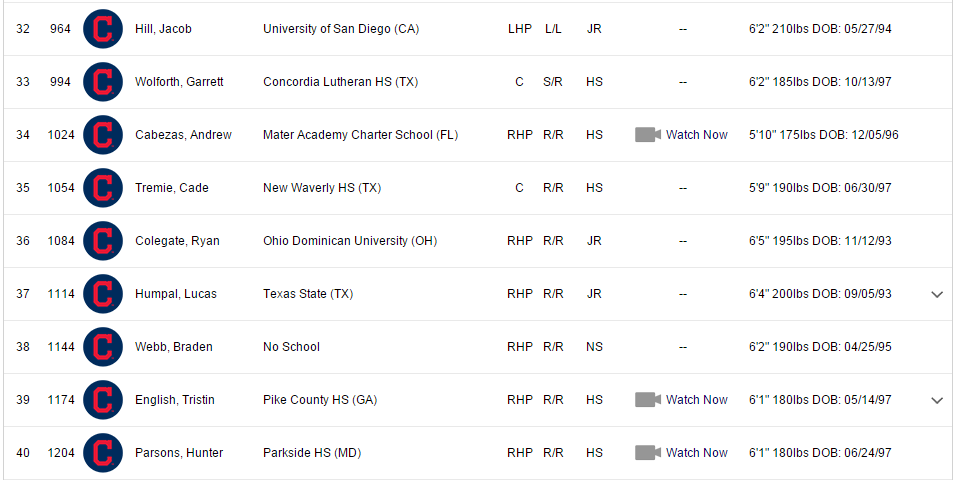 - (59) Juan Hillman LHP – One day, three arms. The Tribe used their first three picks on pitchers for the first time since 2004. Hillman committed to UCF, and was living with his godfather, former MLB pitcher Tom Gordon. He throws a curveball, changeup and a low 90s fastball.