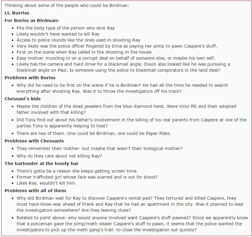 McCandless (Catalyst dude that met with Osip in the office, also who Frank is trying to find the hard drive for, ALSO this is probably his house since he had a personal office), Osip (Russian who was supposed to go halfsies with Ray on the land deal before Caspere’s murder), Holloway (Chief of Vinci PD) and Tony Chessani (mayor’s son)