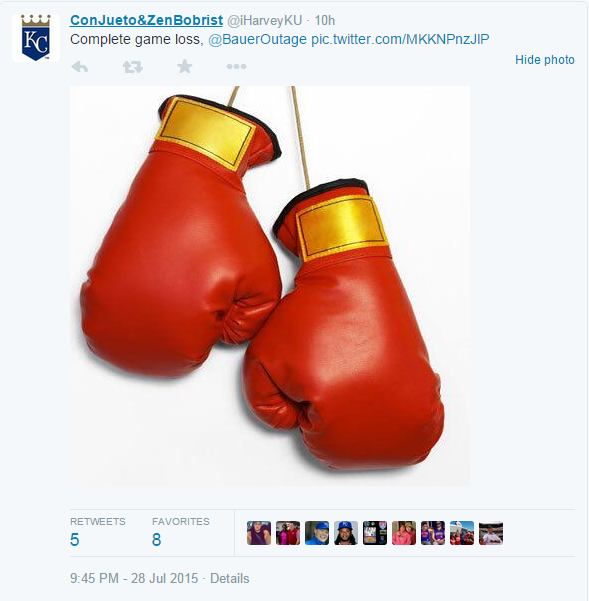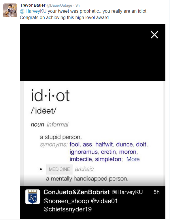 This was in reference to Bauer wearing boxing gloves in the dugout because the Royals had gotten into like sixteen bench clearing brawls leading up to their series in Cleveland at the end of April: