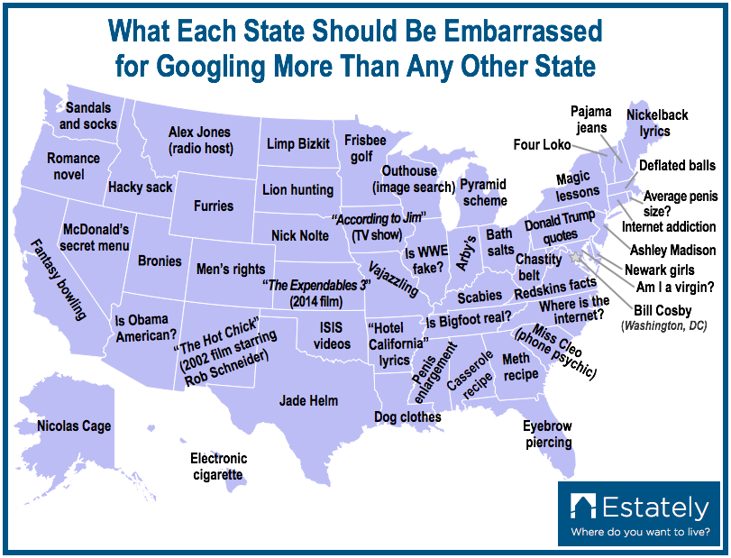 Every U.S. state has its own unique interests and curiosities, and that’s especially true when it comes to internet searches. To highlight those differences we here at the real estate search site Estately dug through 11 years of Google search data to see which terms users in each state Googled more than any other. Each of these terms was selected because we deemed them particularly embarrassing or shameful.