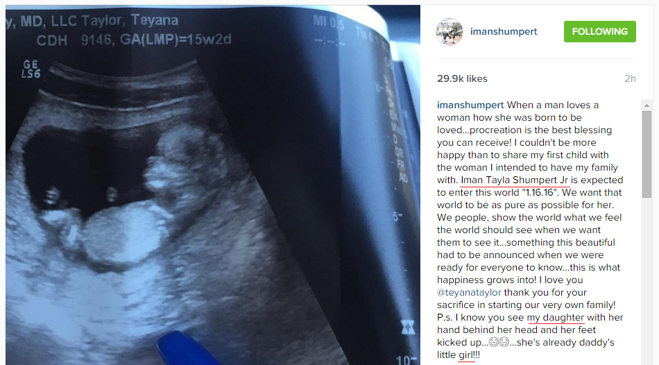 Shump’s Instagram– When a man loves a woman how she was born to be loved…procreation is the best blessing you can receive! I couldn’t be more happy than to share my first child with the woman I intended to have my family with. Iman Tayla Shumpert Jr is expected to enter this world “1.16.16”. We want that world to be as pure as possible for her. We people, show the world what we feel the world should see when we want them to see it…something this beautiful had to be announced when we were ready for everyone to know…this is what happiness grows into! I love you @teyanataylor thank you for your sacrifice in starting our very own family! P.s. I know you see my daughter with her hand behind her head and her feet kicked up…😂😂…she’s already daddy’s little girl!!!
