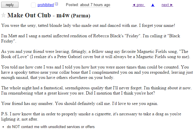 It’s been awhile but Cleveland Craigslist Missed Connections is back. I wanted to try and make this a weekly scheduled post but unfortunately the postings over there haven’t been consistent enough to do that. This batch doesn’t disappoint though.