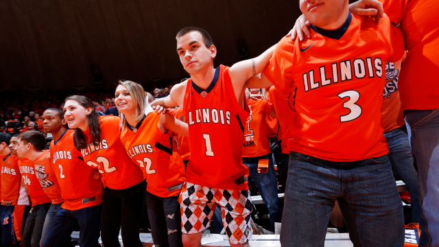 Iowa v Illinois November 14, 2015 640 × 360 Illinois Fighting Illini Cheerleader & Fanbase Gallery CHAMPAIGN, IL – FEBRUARY 1: Illinois Fighting Illini fans cheer against the Iowa Hawkeyes during the first half of the game at State Farm Center on February 1, 2014 in Champaign, Illinois. (Photo by Joe Robbins/Getty Images)