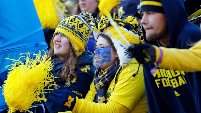 Ohio State v Michigan November 28, 2015 640 × 360 Michigan Wolverine Cheerleader & Fanbase Gallery ANN ARBOR, MI – NOVEMBER 30: Michigan Wolverines fans look on against the Ohio State Buckeyes during a game at Michigan Stadium on November 30, 2013 in Ann Arbor, Michigan. (Photo by Gregory Shamus/Getty Images)