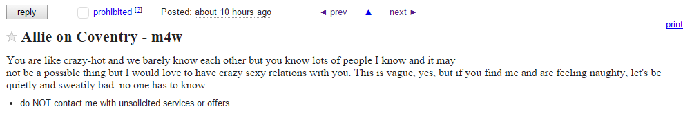 2 December 2, 2015 1002 × 178 Vampires, Coventry, and Beaver Anus; This Week In Cleveland Craigslist Missed Connections I’m pretty sure this guy posts on Craigslist Missed Connections frequently because I know I’ve seen the term “quietly and sweatily bad” before
