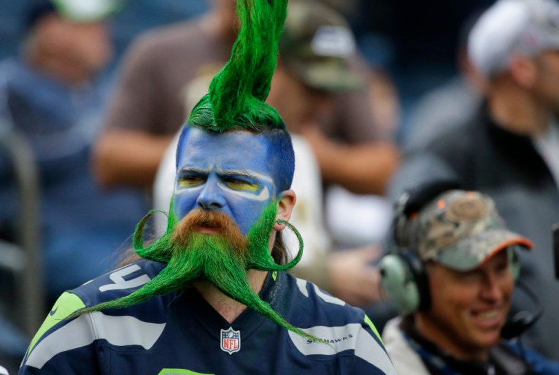 AP GIANTS SEAHAWKS FOOTBALL S FBN USA WA December 20, 2015 1000 × 672 Seattle Seahawks Cheerleader & Fanbase Gallery A bearded Seattle Seahawks fans watches warmups before an NFL football game between the Seattle Seahawks and the New York Giants, Sunday, Nov. 9, 2014, in Seattle. (AP Photo/Elaine Thompson) ORG XMIT: OTK