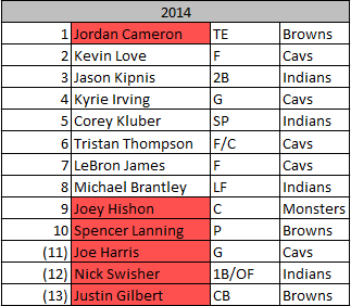 Last year, California dreamboat Jordan Cameron edged out Kevin Love by a whopping 2.25 points to earn the inaugural AI’s Hottest Cleveland Professional Athlete crown. A quick review of those results:
