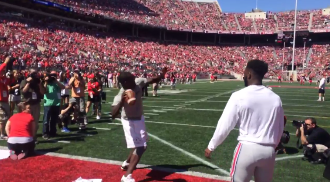 Cardale and JT Barrett had a long toss competition. JT crow hopped a few times and hit 62 yards. Cardale threw it flat footed and dropped it 64 yards away.