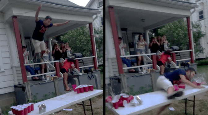 Now I’m not the foremost authority on the beer pong dunk but I’m pretty sure that one of the main requirements of dunking is that you have a table that will 100% break once you land on it. You know, one of those shitty brown laminated ones that everyone has. If you’re gonna go big and jump off the porch like this, you gotta be absolutely positive that the table is cheap and will collapse like you just got 3-D’ed by Bubba Ray Dudley. I like this kid’s moxie and showmanship but his decision making is just poor. I award him no points and may God have mercy on his soul and ACL.