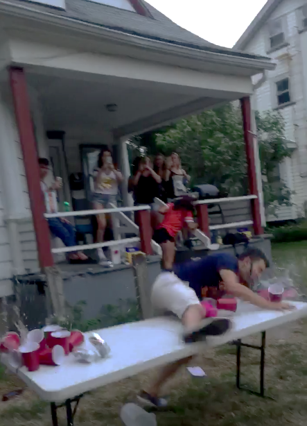 “Aaaahhh, I’m jumping off a front porch to dunk a ping pong ball into a red Solo cup! Take a good picture, honey, I’m dead!”