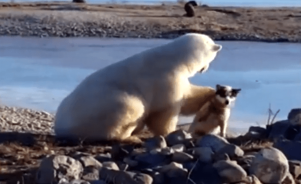 This massive polar bear and dog are apparently best friends it looks like