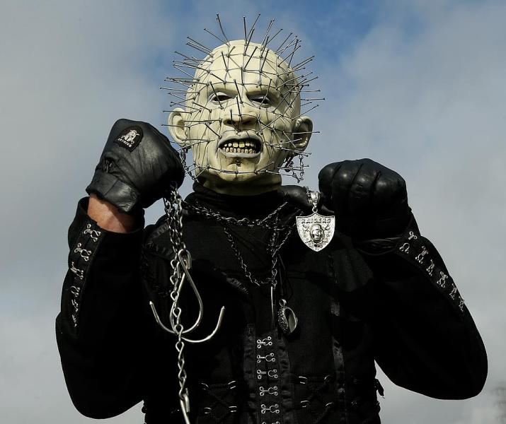 Oakland Raiders fan who calls himself HellRaider poses for a photograph in the O.co Coliseum parking lot before an NFL football game between the Oakland Raiders and the Cleveland Browns in Oakland, Calif., Sunday, Dec. 2, 2012. (AP Photo/Marcio Jose Sanchez)