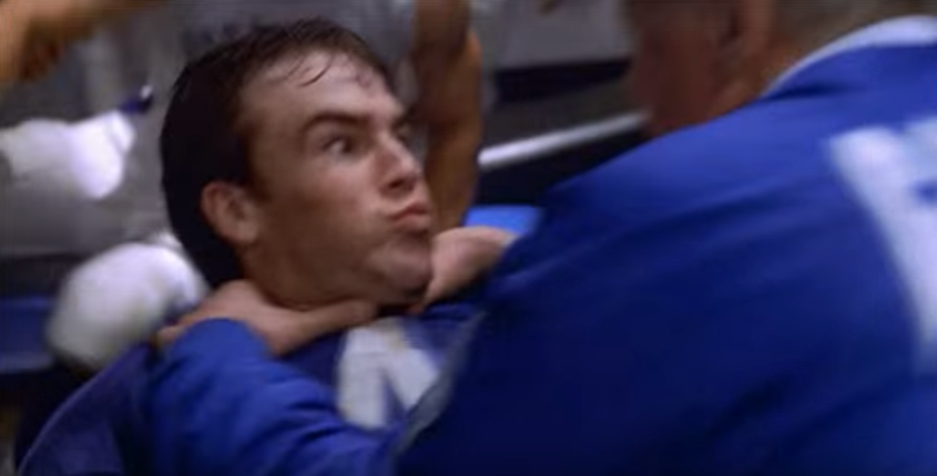 If he didn’t have a locker room full of teammates to break up a fight, he would have gotten beat up by a 60 year old. Mox talks a big game but he’s all bark no bite when Kilmer comes at him. Just look at the terror in this face: