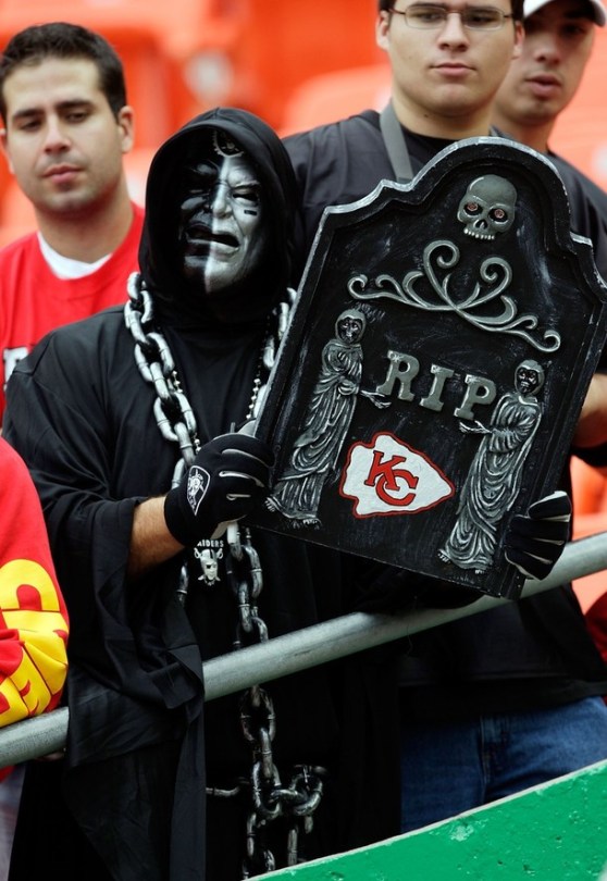 Oakland Raiders v Kansas City Chiefs October 25, 2014 610 × 886 Oakland Raiders v Kansas City Chiefs KANSAS CITY, MO – SEPTEMBER 20: An Oakland Raiders holds a sign predicting the outcome during the game against the Kansas City Chiefs at Arrowhead Stadium on September 20, 2009 in Kansas City, Missouri. (Photo by Jamie Squire/Getty Images)