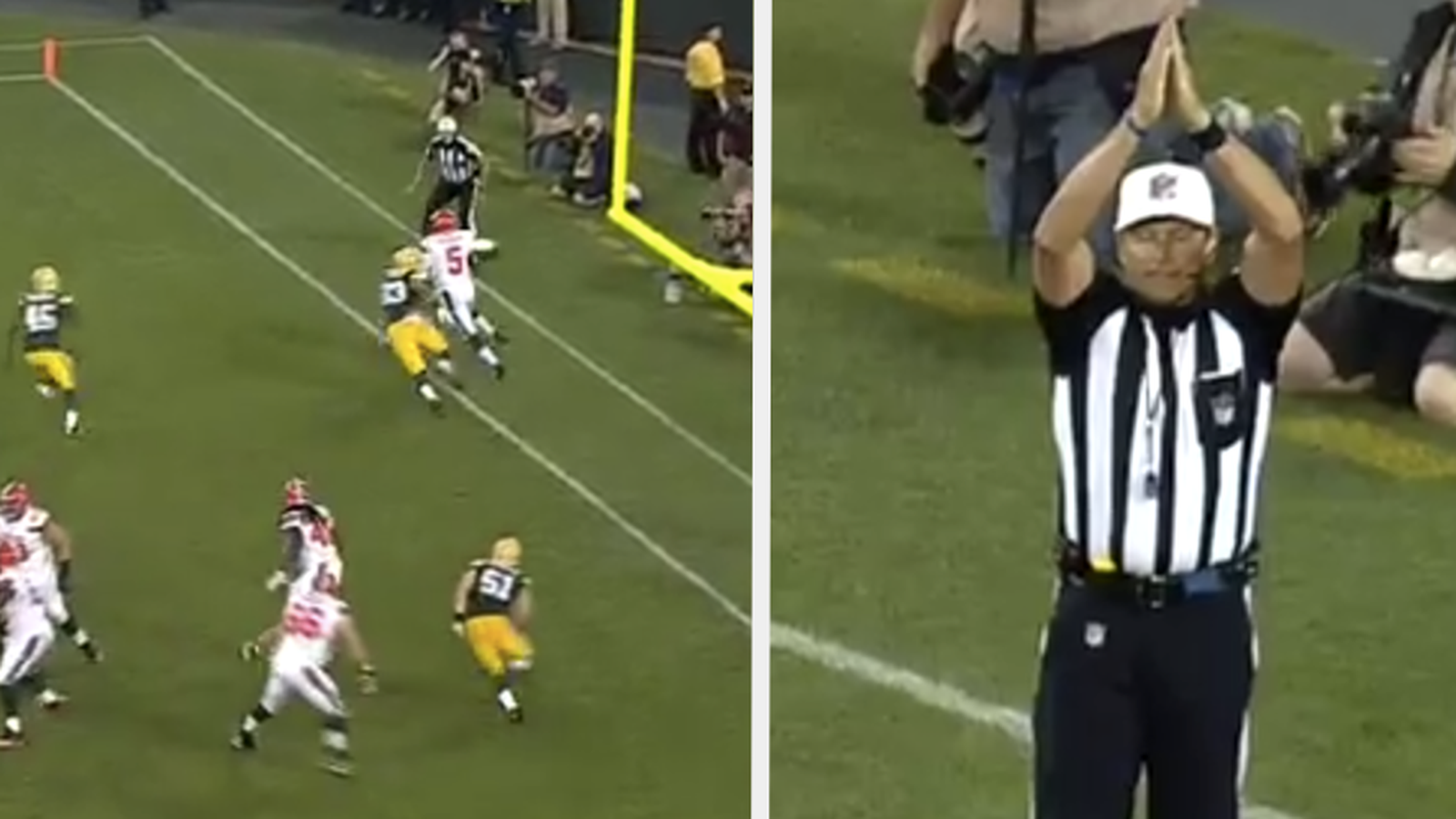 Nationally televised game. The Browns are lining up for a last second field goal to win the game. The snap is down, the kick is up-
