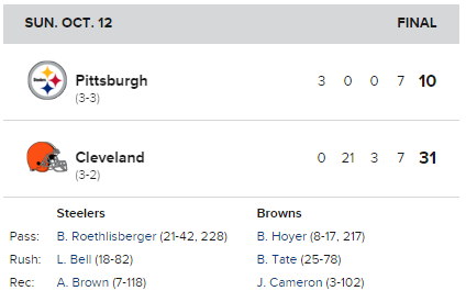 A couple plays later Hoyer threw the dagger interception. Sigh. And the Browns fall to 3-3.